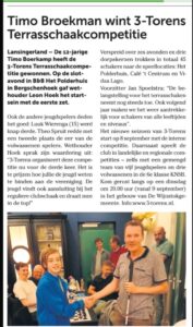 Ook deze zomer hebben we een mooie Terrasschaakcompetitie gehad. Op verschillende locaties in onze gemeente hebben we serieus, fanatiek en gezellig geschaakt. Meestal op het terras, soms ook binnen. Uiteindelijk leverde dit een spannende eindstand op waarbij Timo Boerkamp de winnaar van Terrasschaken 2025 is geworden. Gefeliciteerd!